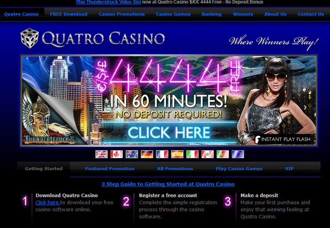 Current New Player Promotions at Quatro CasinoOnce you have downloaded their software and registered as a brand new real money player you are then free to set forth with their staggeringly large $/£/€ 4444 no deposit bonus, this will be available to you in your casino account and your task is simple, and that is to try and win as much as you can in the next sixty minutes!
