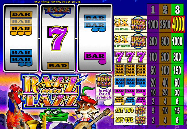 About the Razz Ma Tazz SlotThe Razz Ma Tazz slot a 3 reel slot game from Microgaming and this slot is built around a musical animal type theme! The real symbols as you can see from the picture of the slot above include Single Bars, Double Bars as well as Triple Bars. There is also a special Razz Ma Tazz logo which is the jackpot symbol.