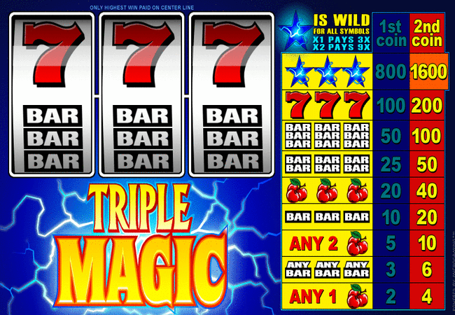 About the Triple Magic SlotThe Triple Magic slot a 3 reel slot game from Microgaming and this slot is built around a simple and very classic type slot theme, the reel symbols include a Cherry, three lots of Bars, a Red 7 and the Triple Magic logo symbol which is your jackpot symbol and also a wild multiplier.