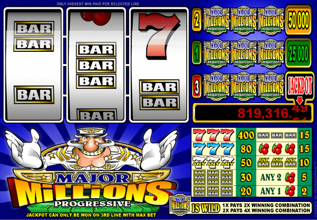The Major Millions 3 Reel slot is a Microgaming progressive slot game and this means that US based players cannot currently play it as Microgaming powered online casinos do not accept new USA based players, if you are based in the US then visit or US friendly casinos who have a large range of 3 reel slots. The software providers are Vegas Technology, Real Time Gaming and Rival.