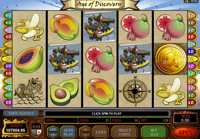 About the Age of Discovery SlotThe Age of Discovery slot has 5 reels and is a video slot game, you can play from 1 to 25 lines on each spin and you can play upto 10 coin per line per spin also. This slot has a top prize payout of 6000 coins and the theme of this slot is one of a sea voyage.