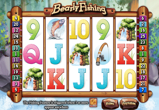 About the Bearly Fishing SlotThe Bearly Fishing slot has 5 reels and is a video slot game, you can play 25 lines on each spin and you can play upto 10 coins per line per spin also. This slot has a top prize payout of 6000 coins and the theme of this slot is one of a hot summer beach.