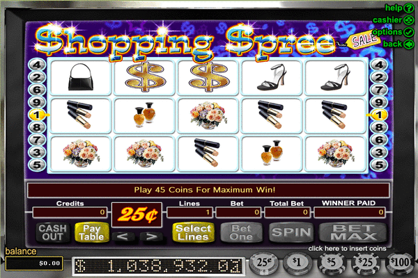 Shopping Spree has 5 reels, and if you wish to know the payout schedule of this slot then all you need to do is to give the pay table a click you do this by pressing the "pay table button located next to the cash out button on the lower left side of the machine. You can at all times keep track of the current jackpot total via the progressive jackpot ticker which is displayed on the bottom of the machine. The rest value of this progressive slot game is an impressive $25,000 and the slot has a fixed coin value of $0.25.