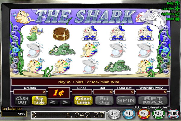 The Shark slot game is a progressive slot from Real Time Gaming, this slot is has nine pay lines and is a 5 reel progressive slot. It has a fixed coin value of 1 cent and you can play upto 45 coins per spins, so it is a relatively cheap progressive slot game to play!