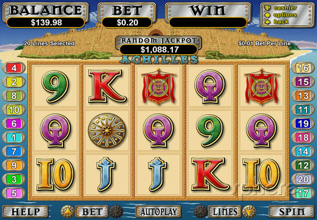 About the Achilles SlotThe Achilles Slot slot has 5 reels and on this slot game you can play 20 coins on each spin, the coin levels are set at $0.01, $0.02, $0.05, $0.1, $0.25, $0.5, $1, $5.00, US based players are permitted to play at Real Time Gaming powered online casinos.