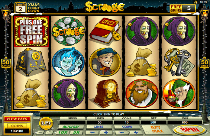 Bonus Features on the Scrooge SlotAs the Scrooge slot machine is a bonus video slot game it has Bonus Features, to be awarded them you first need to spin in anywhere in view as you play the base game, either a Plus One Free Spin or a Plus One Day symbol, every time you do these add to the bank at the top of the screen, when you make it to the 25th of December by virtue of the Plus One Day symbol you are awarded the number of Free Spins you have saved up!