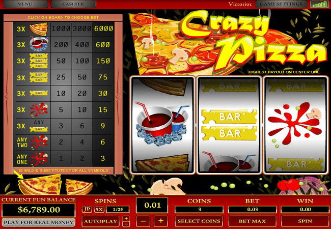 About the Crazy Pizza SlotThe Crazy Pizza slot has 3 reels and on this slot game you can play 3 coins on each spin, the coin levels are set at $0.01, $0.05, $0.10, $0.25, $0.5, $1, $3, $5. US based players are permitted to play at Top Game powered online casinos.