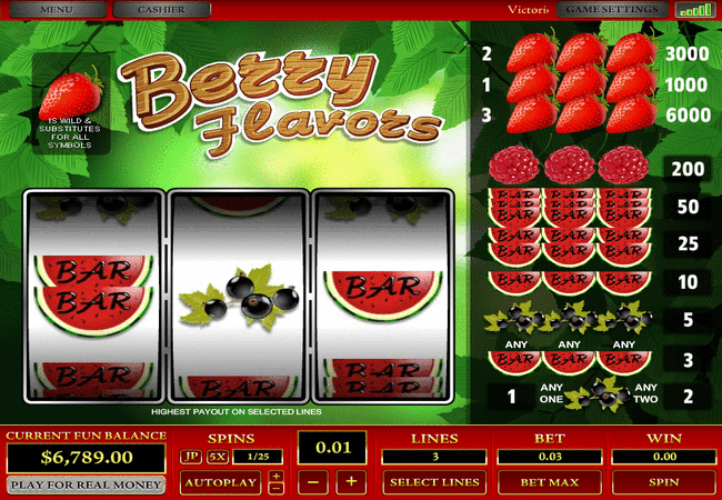 About the Berry Flavors SlotThe Berry Flavors Slot slot has 3 reels and on this slot game you can play 3 coins on each spin, the coin levels are set at $0.01, $0.05, $0.10, $0.25, $0.5, $1, $3, $5 US based players are permitted to play at Top Game powered online casinos.