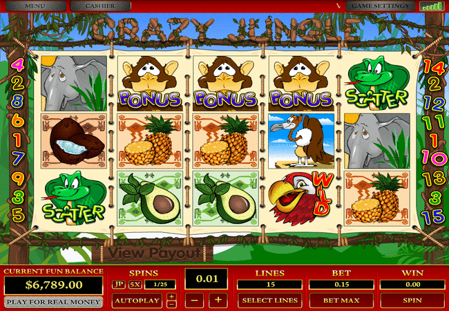 About the Crazy Jungle SlotThe Crazy Jungle slot has 15 reels and on this slot game you can play 15 coins on each spin, the coin levels are set at $0.05, $0.10, $0.25, $0.5, $1, $3, $5, US based players are permitted to play at Top Game powered online casinos.